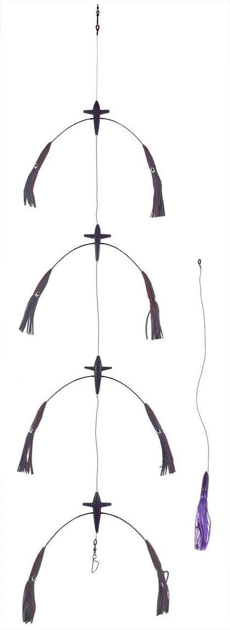 Expertly assembled for maximum surface action, the PlayAction Splash Dancer Chains are the perfect addition to any offshore trolling spread. These chains consist of 4 separate Splash Dancer Rigs that consist of a 5in Humming Bird that connects two 9in bulb squids via a steel wire. That gives you 4 birds and 8 squid to simulate a delicious looking school of bait, and a 9in Machine Stinger rigged with an 8/0 heavy duty southern tuna hook to seal the deal. All connection points are professionally crimped with chafe gear for maximum reliability. These chains are great for catching tuna, wahoo, dolphin, billfish and more. The Splash Dancer Chains are especially effective when pulled from the long rigger or down the middle just behind the long rigger, but will also work well from anywhere else in the spread.