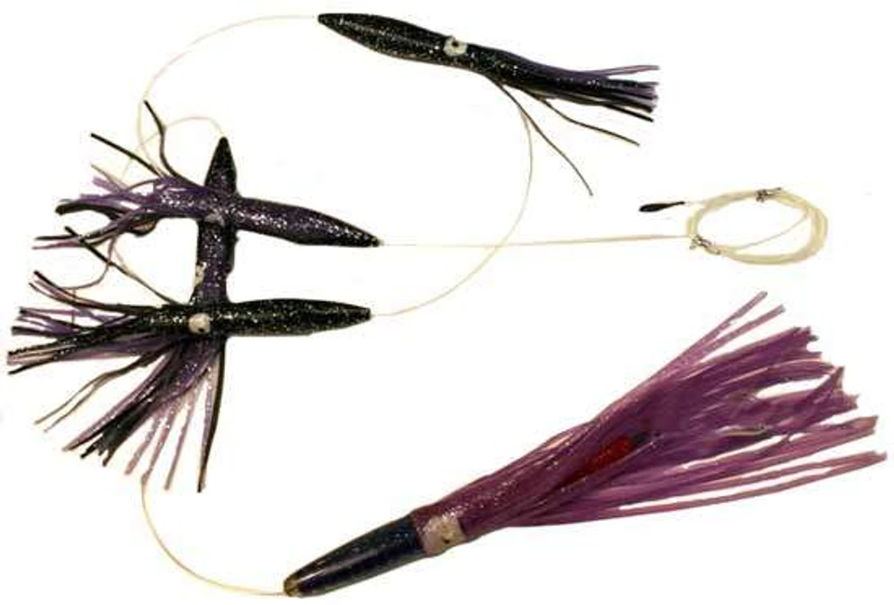 Our 12 Inch Sportfish Machine Squid Chain includes (4) 9″ Squids with a 12″ Bright Machine Trailer. These chains will catch and will become a favorite in the cockpit. As always….all of our trolling chains come with a lure bag included.